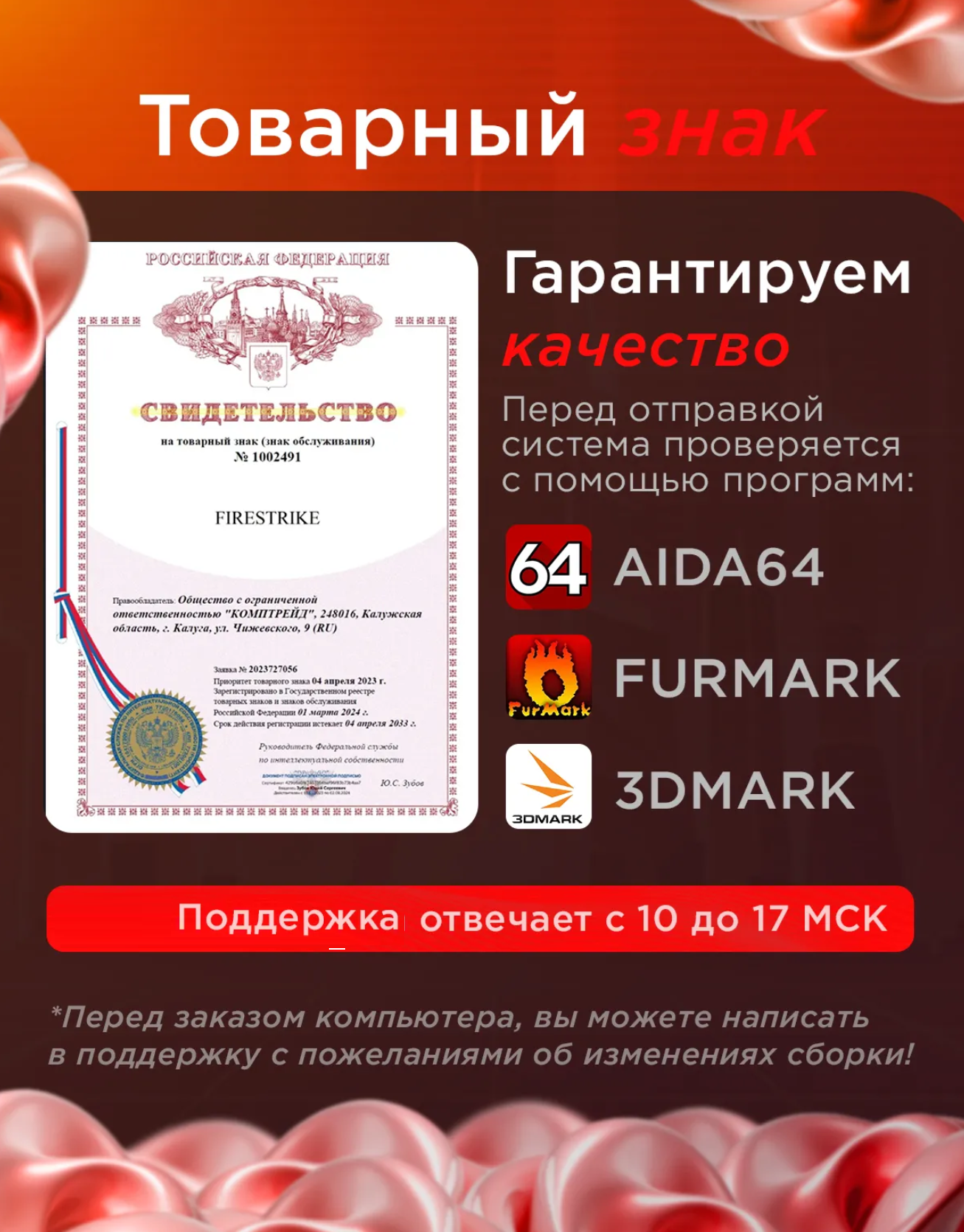 Каждая сборка проходит многоэтапное тестирование: 24-часовой стресс-тест в AIDA64 и OCCT, бенчмарки в 3DMark Time Spy, проверка температур под нагрузкой (CPU ≤80°C, GPU ≤75°C), контроль стабильности частот и отсутствие артефактов. Любые отклонения устраняются до идеала.